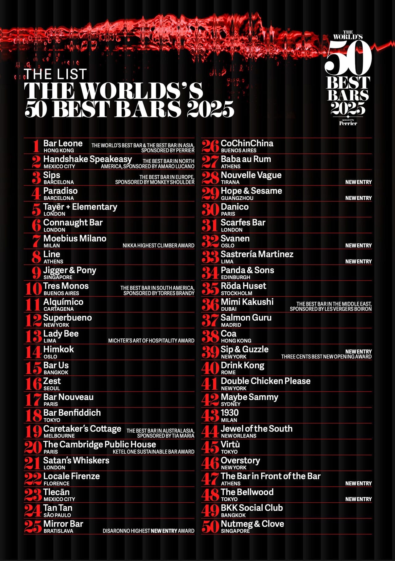 Ce mercredi 8 octobre à Hong Kong s'est tenue la cérémonie des 50 Best Bars 2025. Bar Leone (Hong Kong) a décroché la première place, devenant ainsi le premier bar asiatique à être sacré meilleur bar du monde, tandis que Handshake Speakeasy (Mexico City ; 2e), Sips (Barcelone ; 3e), Paradiso (Barcelone ; 4e) et Tayēr + Elementary (Londres ; 5e) complètent le Top 5.