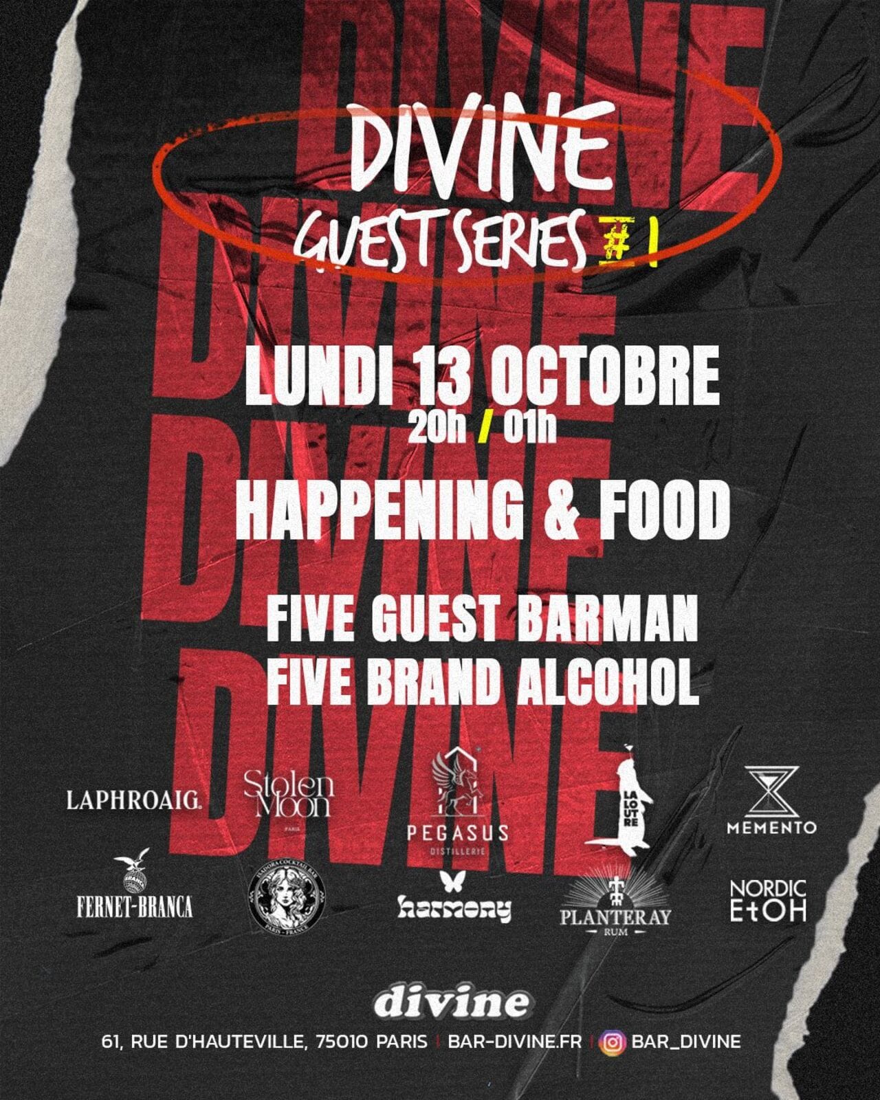 Le bar parisien Divine organise le 13 octobre sa première Guest Series : 5 duos associant brand ambassadeurs et bartenders invités se succèderont de 20h à 1h pour proposer des cocktails inédits à base de Nordic EtOH, Laphroaig, Pegasus, Planteray et Fernet-Branca.
