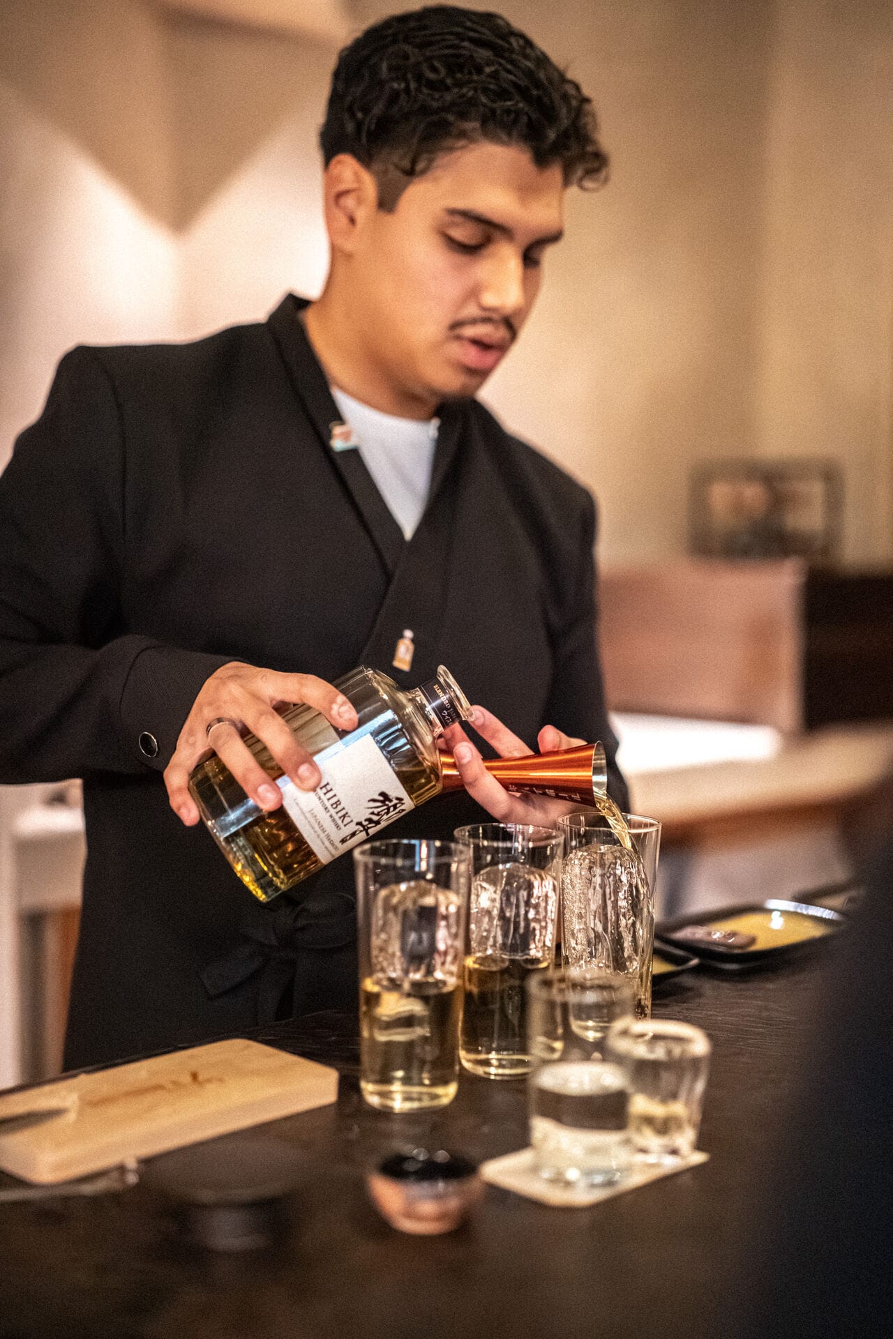 Le cadre était fixé : dix minutes par candidat pour partager son interprétation personnelle d'Hibiki Japanese Harmony : la recette, les gestes, la mise en scène, la narration. Le tout devant un jury resserré composé de fins connaisseurs : Alexandre Vingtier, spécialiste du whisky et auteur reconnu dans le domaine des spiritueux, passé notamment par les jurys des World Whisky Awards et du MOF Barman ; Amaury Guyot, spécialiste du whisky et du taillage de glace, qui s'est illustré au Sherry Butt et au restaurant Dersou notamment ; et Frédéric Paolini, fondateur du bar japonais SAKA à Paris.