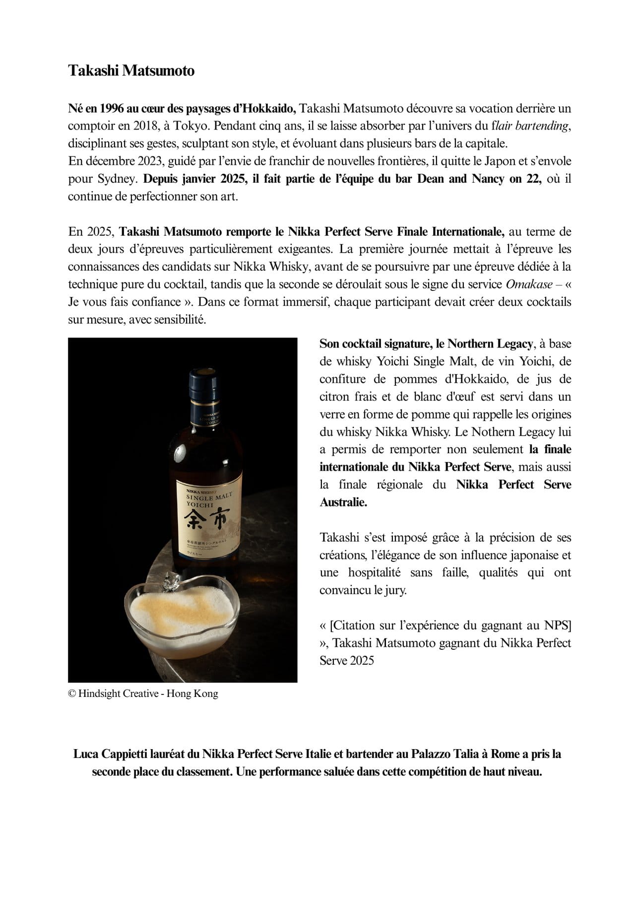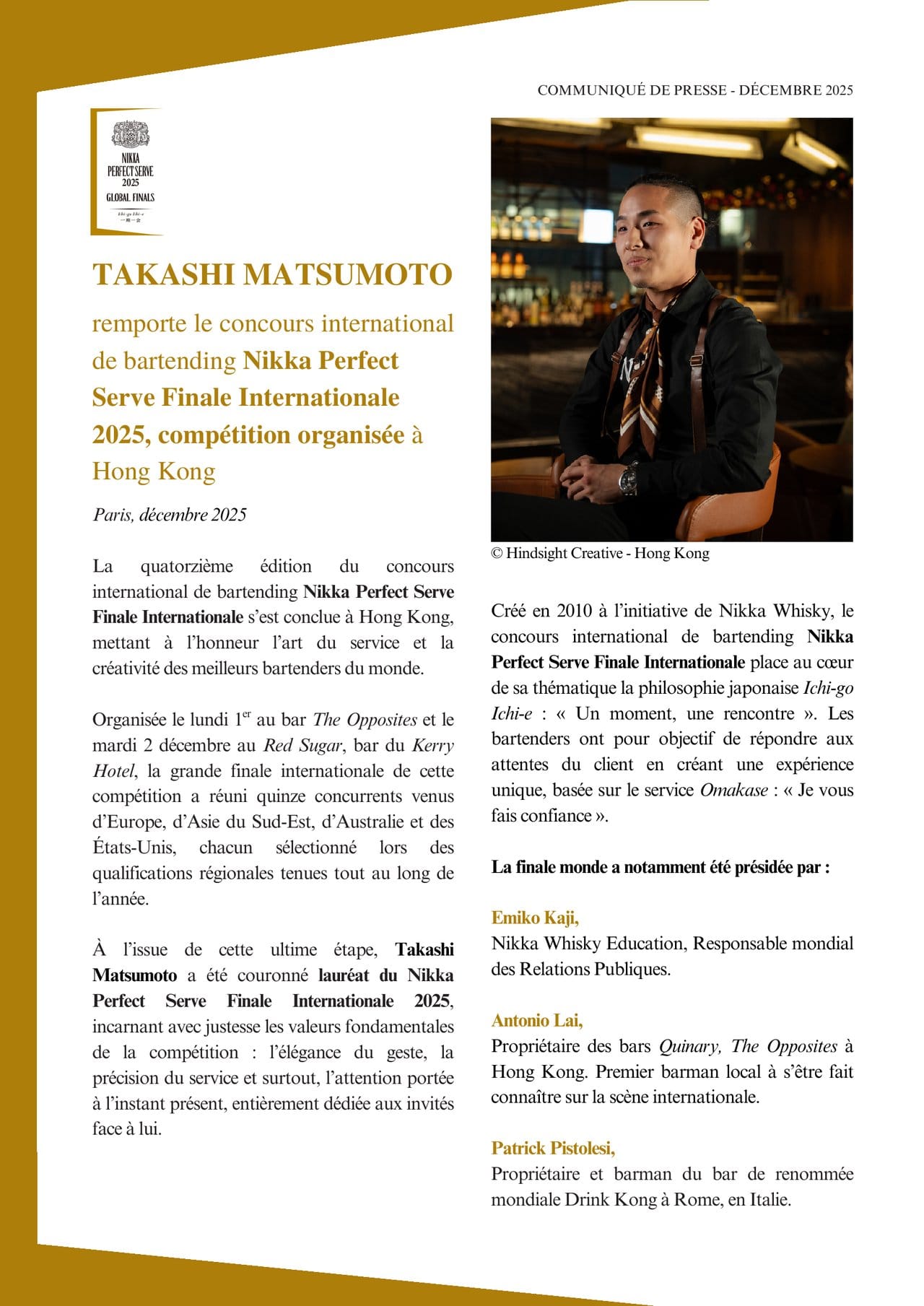 En 2025, Takashi Matsumoto remporte le Nikka Perfect Serve Finale Internationale, au terme de deux jours d'épreuves particulièrement exigeantes. La première journée mettait à l'épreuve les connaissances des candidats sur Nikka Whisky, avant de se poursuivre par une épreuve dédiée à la technique pure du cocktail, tandis que la seconde se déroulait sous le signe du service Omakase – « Je vous fais confiance ». Dans ce format immersif, chaque participant devait créer deux cocktails sur mesure, avec sensibilité.
