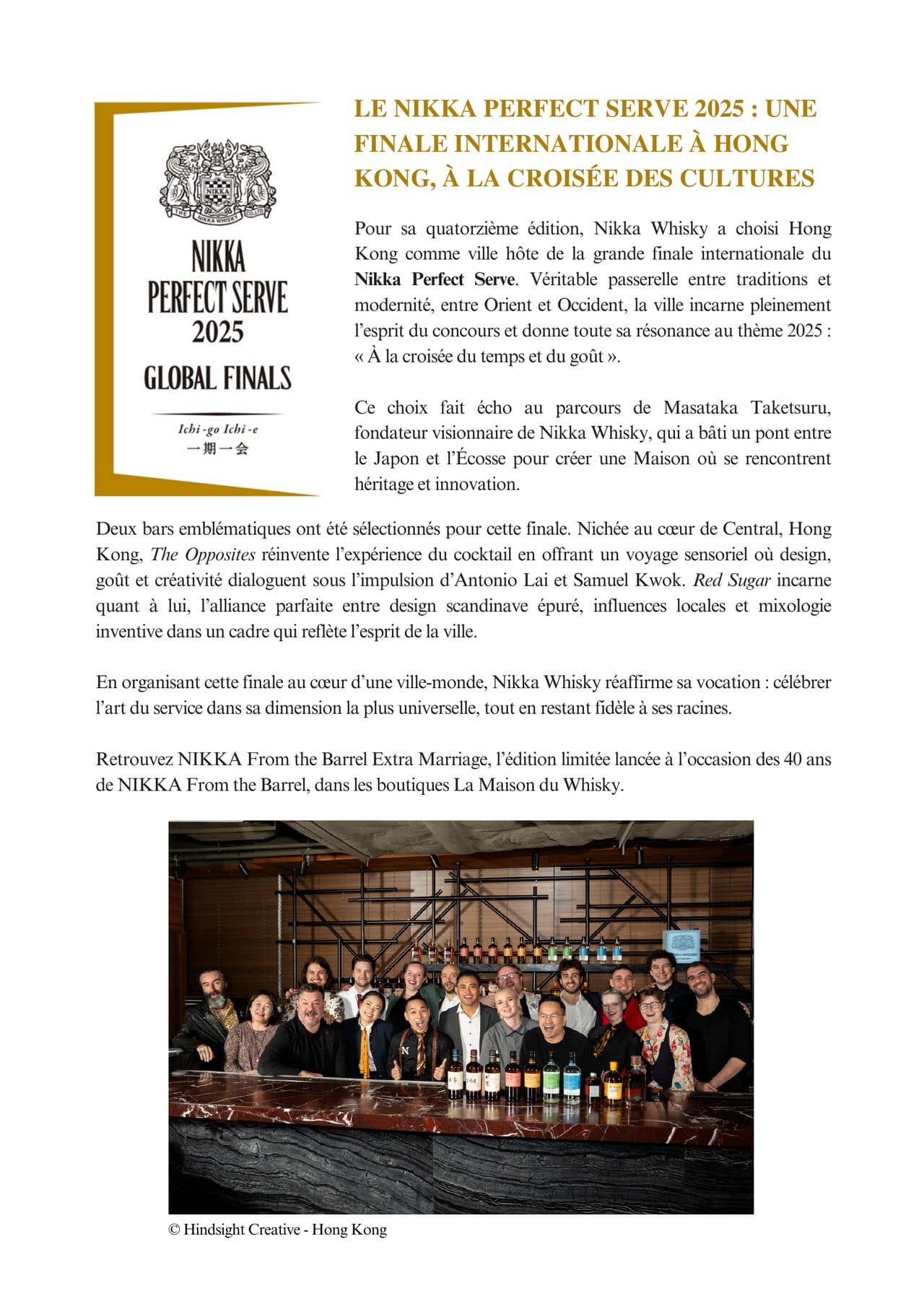 Pour sa quatorzième édition, Nikka Whisky a choisi Hong Kong comme ville hôte de la grande finale internationale du Nikka Perfect Serve. Véritable passerelle entre traditions et modernité, entre Orient et Occident, la ville incarne pleinement l'esprit du concours et donne toute sa résonance au thème 2025 : « À la croisée du temps et du goût ».