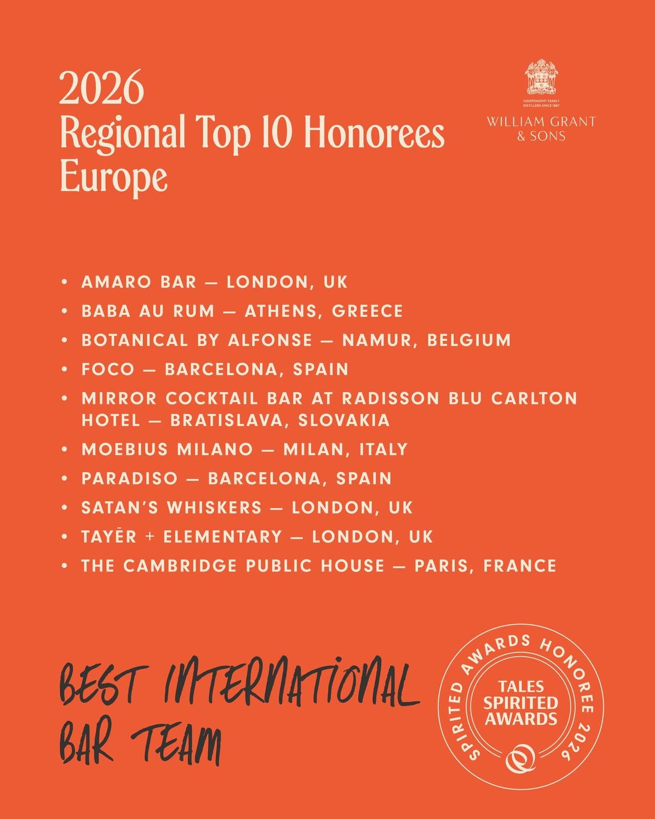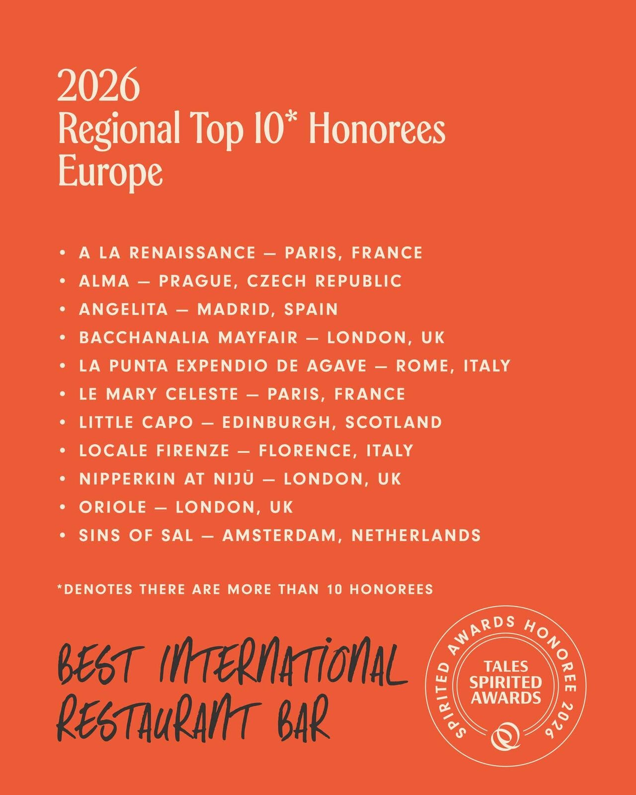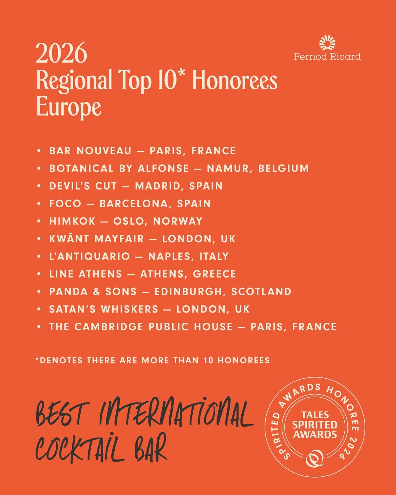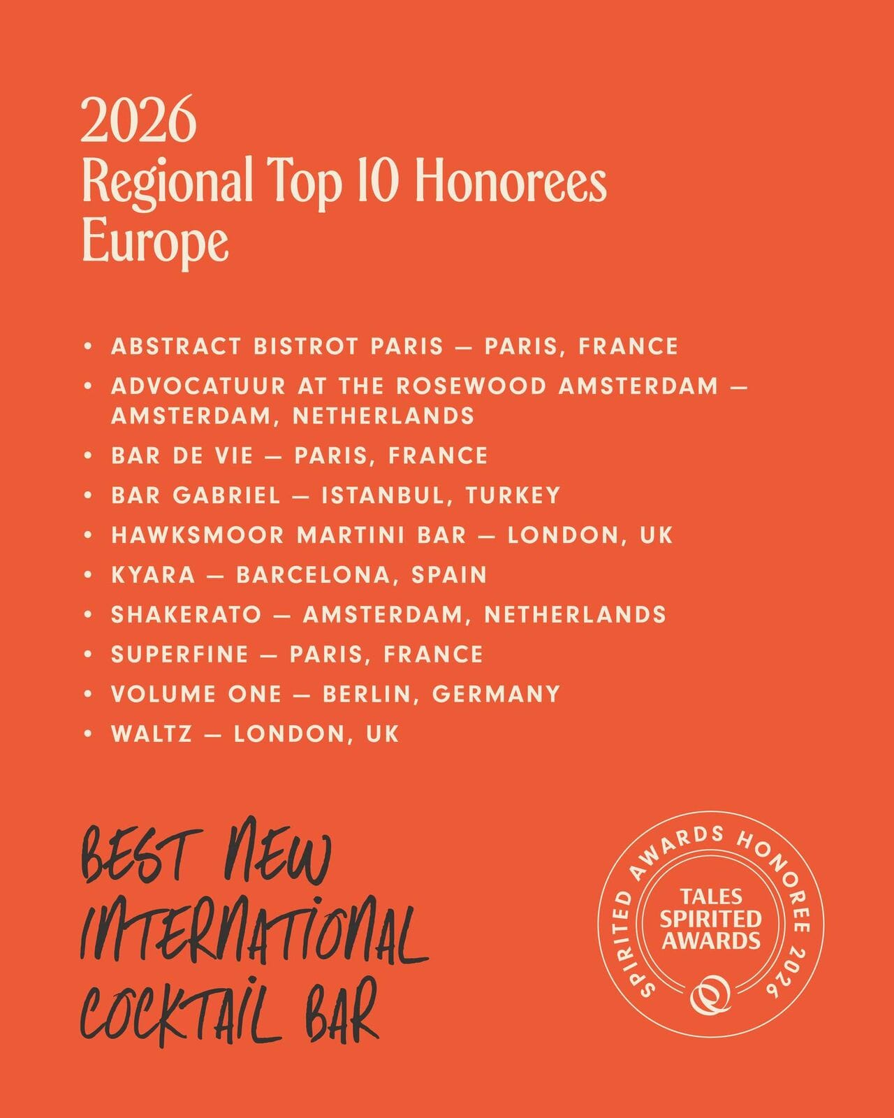 La catégorie Best New International Cocktail Bar est celle où la présence française est la plus forte, avec pas moins de trois nominations sur dix : Abstract Bistrot Paris, Bar De Vie et Superfine. Un signal fort pour le renouvellement de la scène cocktail parisienne, dont on suivra également de très près les positions lors des tout prochains French Bar Awards (résultats dévoilés en mai).