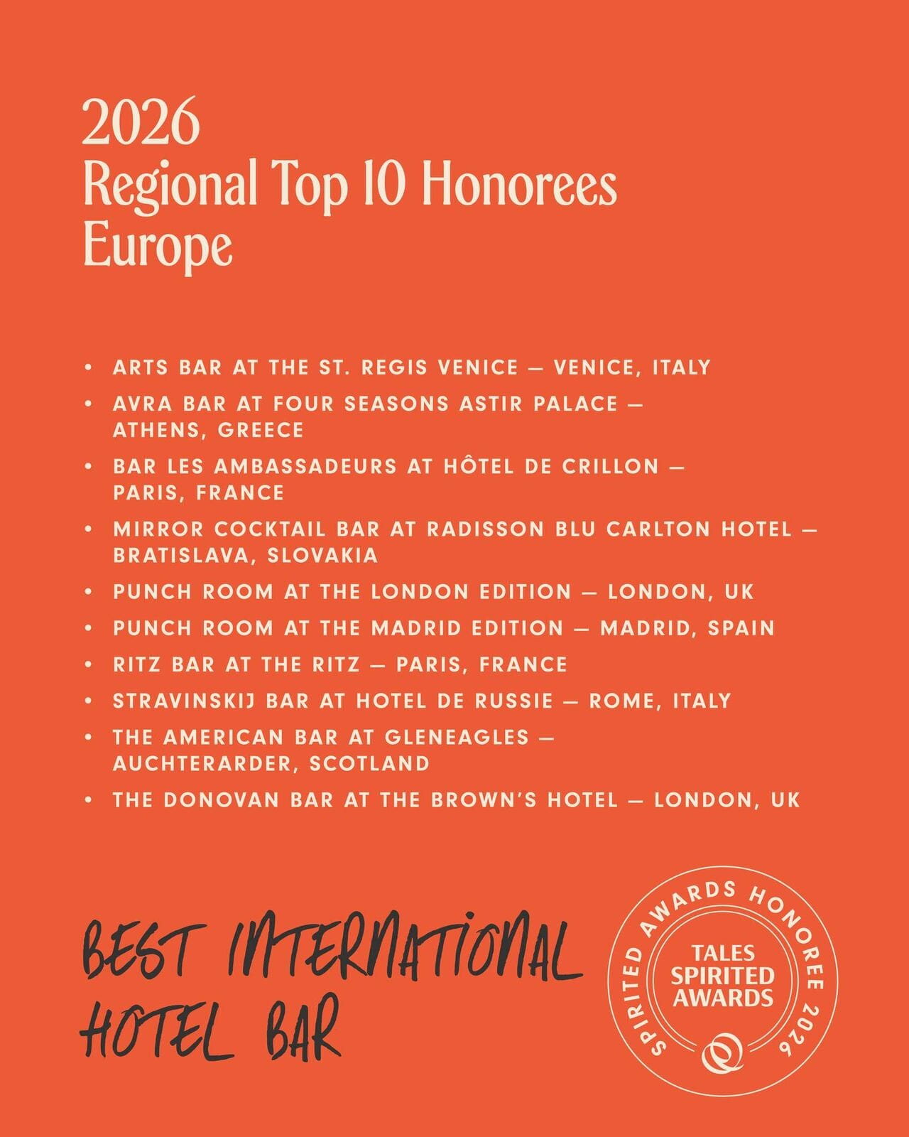 La catégorie Best International Hotel Bar compte pour sa part deux fleurons de l'hôtellerie parisienne : le Bar Les Ambassadeurs de l'Hôtel de Crillon et le Ritz Bar du Ritz.