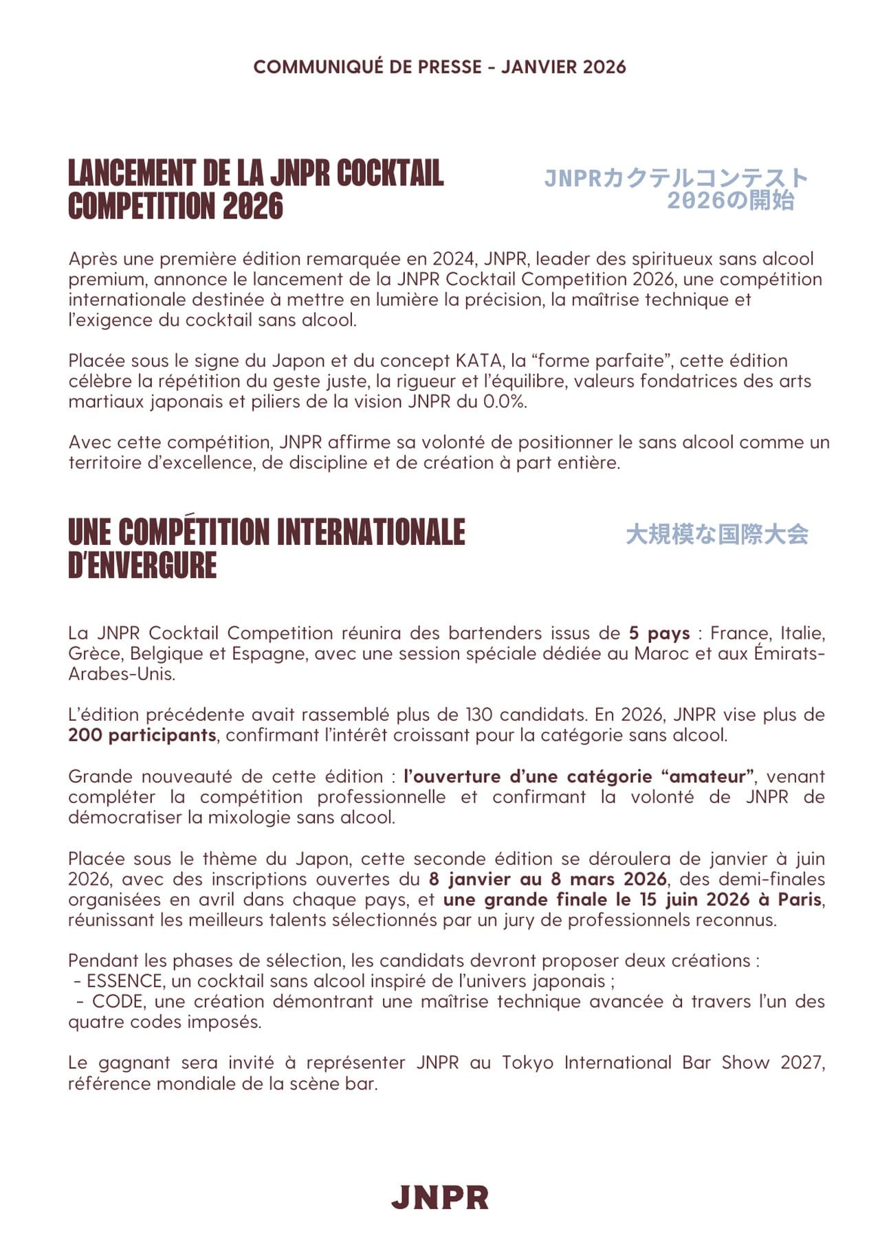 JNPR lance la deuxième édition de sa Cocktail Competition, ouverte aux bartenders de 5 pays européens plus le Maroc et les Émirats. Placée sous le thème du Japon et du concept "Kata", la "forme parfaite", elle inclut désormais une catégorie amateur. La finale aura lieu le 15 juin 2026 à Paris.