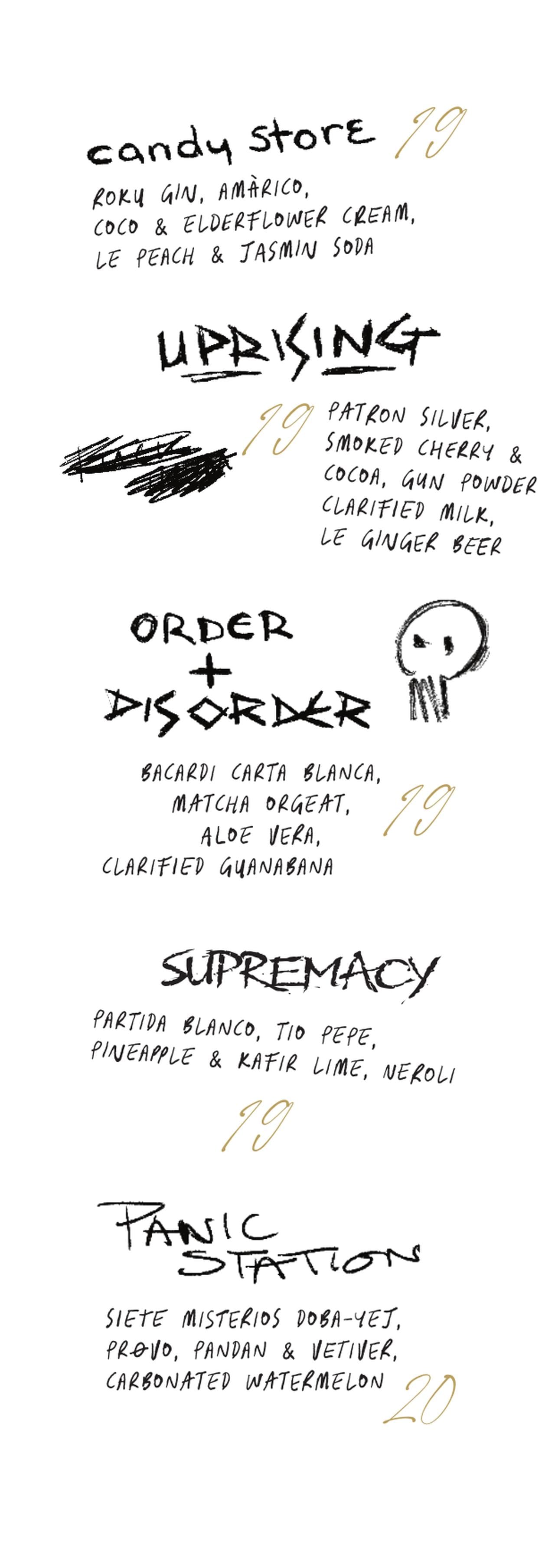 Avec le concept du bar - la rébellion, le Palais de Justice, la loi -, The Will of the People évoquait naturellement le Peuple en mouvement. Je voulais un menu simple et flexible. J'ai participé à de nombreux grands concepts de menus à Scarfes ; c'est passionnant, mais parfois un peu "trop", à maints égards.